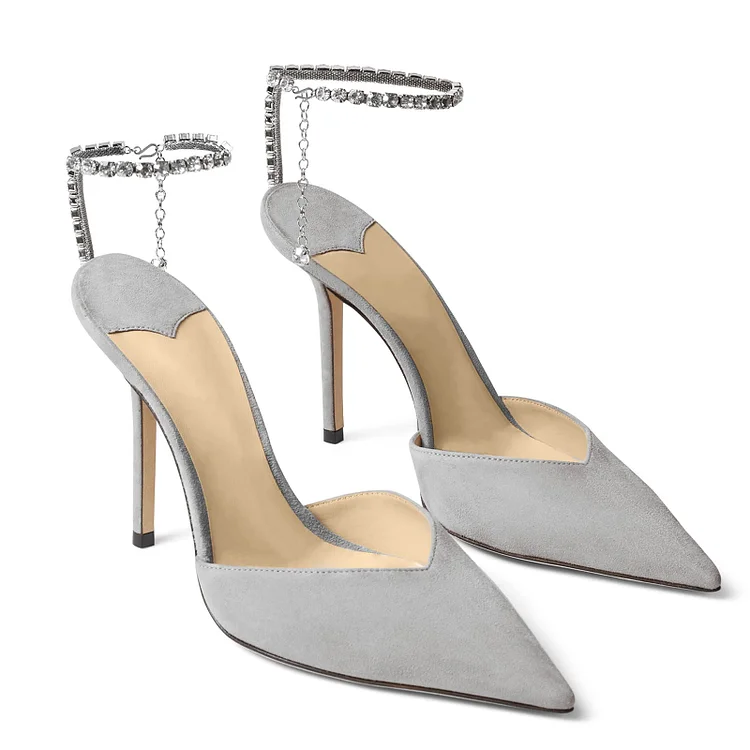 100mm Women's Sandals Crystal Chain Rhinestone Embellished Strap Suede Pumps Pointy Stilettos Backless Shoes